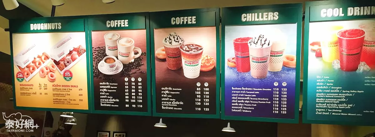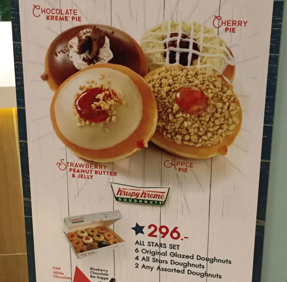 這裡推出12個的組合套餐(296銖),很多看起來都十分美味。沒吃過的朋友,建議先從招牌口味Original Glazed下手,就是甜甜圈外麵包了一層糖膜,陽光下閃耀著賊光,巨甜無比,要是身邊能有一杯espresso配著吃,絕對人生一大享受。