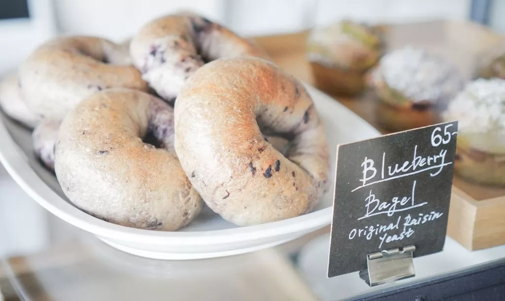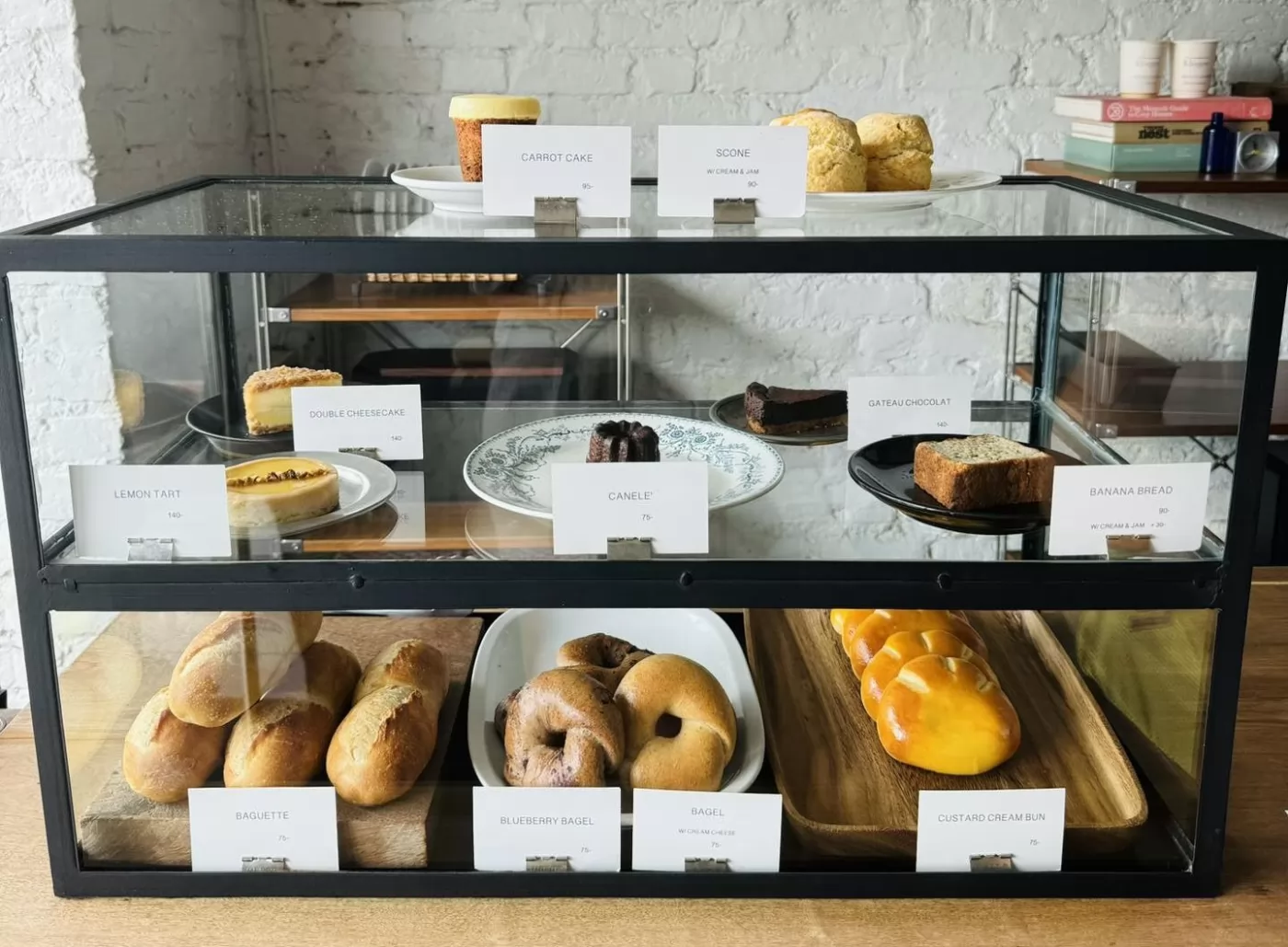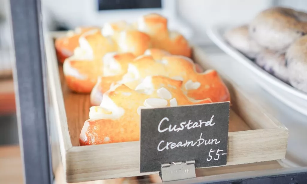 麵包櫃台,陸續補滿從廚房烤箱出爐的菠蘿麵包、甜點和Bagel或Baguette三明治等,這些都是日本籍太太細心烘焙的,強調的是「有機食品和新鮮」,每樣都有英文標示名稱,價格也很平實,在35至80銖之間。