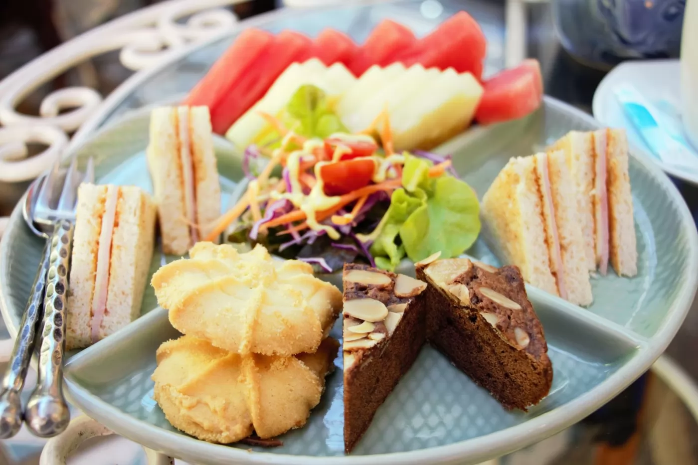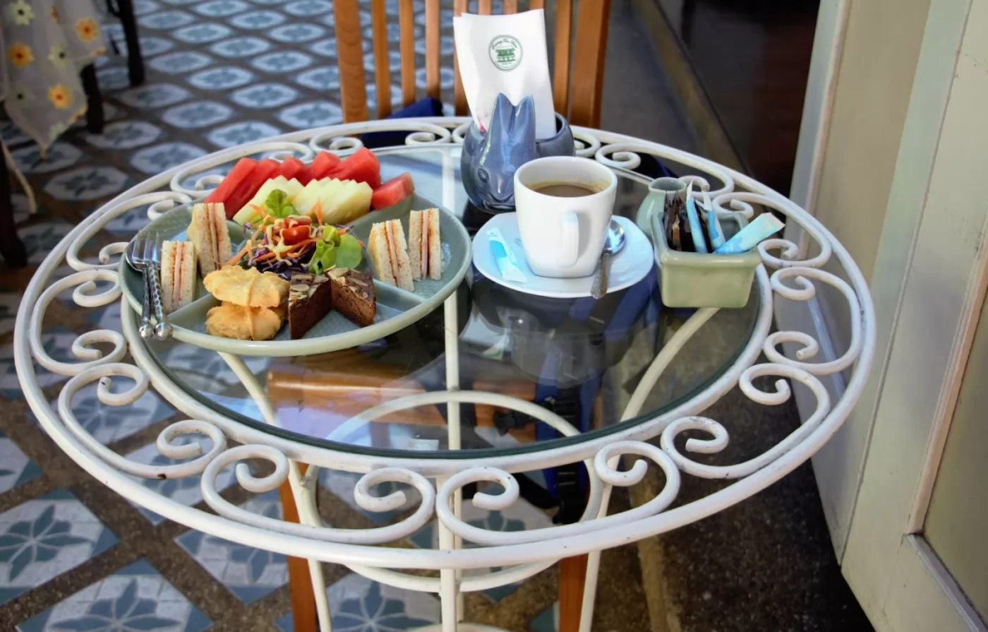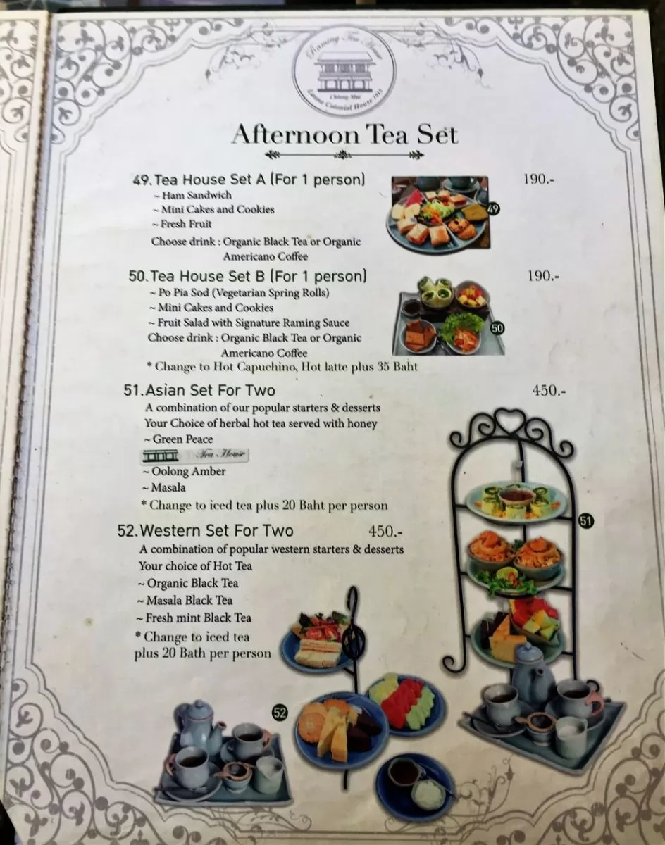 針對個人提供A、B兩種下午茶套餐,190銖(另加10% 服務費),A式有兩種水果、四片三明治、兩塊餅乾、兩片巧克力蛋糕以及一份沙拉,搭配黑咖啡或美式咖啡,很豐富,餐點很好吃!有機會到清邁一定要來試試。