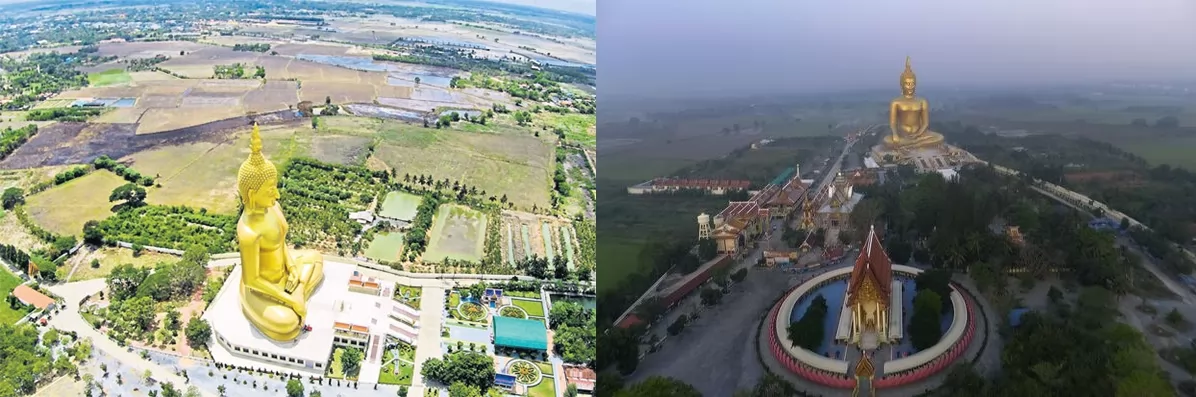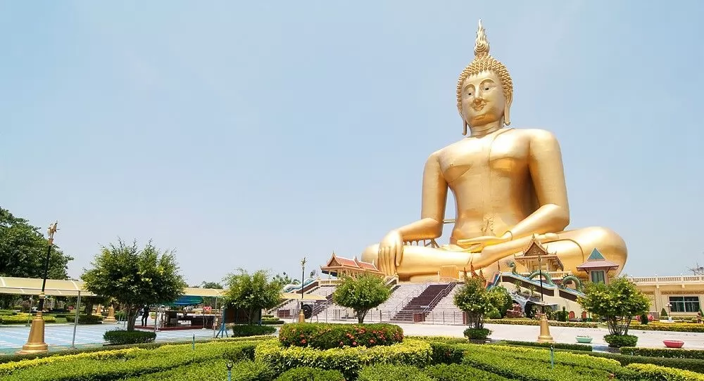 Wat Muang寺內,有世界上最大的粉蓮花瓣圍繞的廟宇,佛堂下層是博物館,上層則供奉著泰國這尊最大的、也是唯一一尊銀製的神聖佛像。