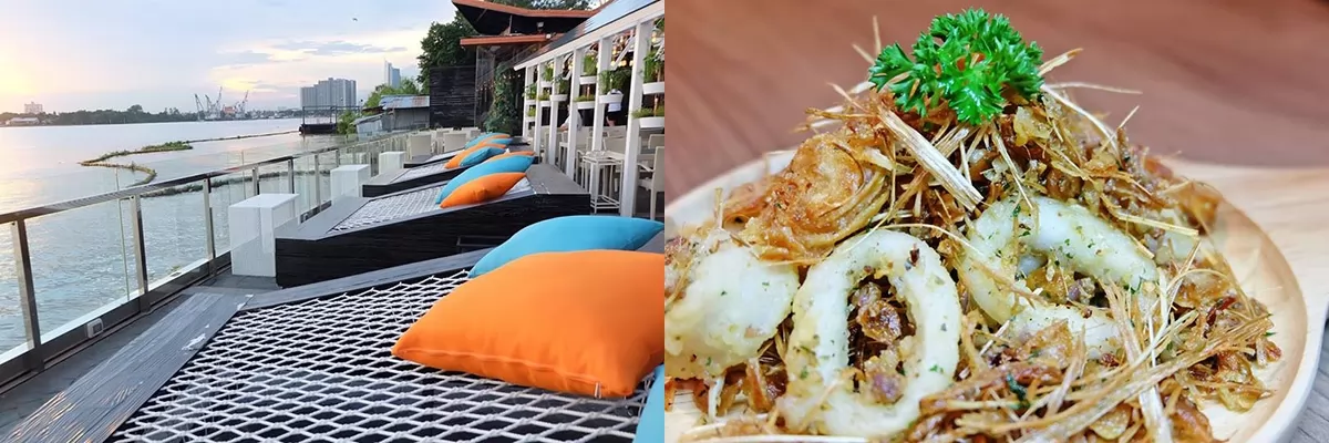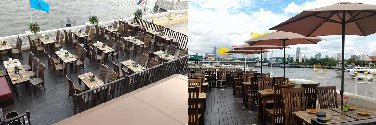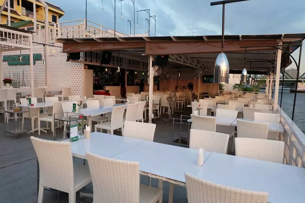位在湄南河畔的餐廳,白色的兩層木板屋,一樓室內接室外,座位臨近河畔,可以欣賞到美麗的河景。二樓室外用餐區靠後,視野也不錯。