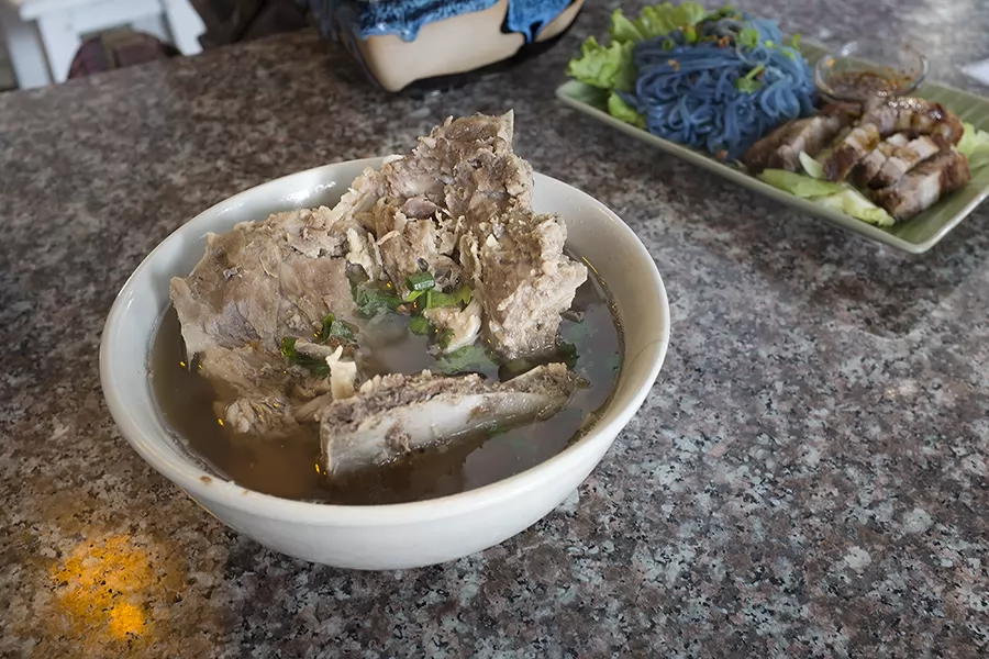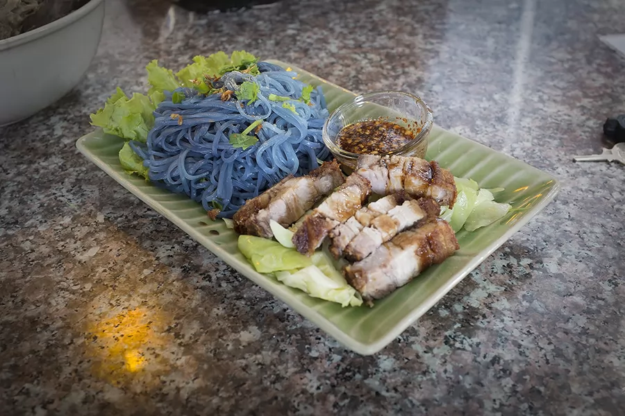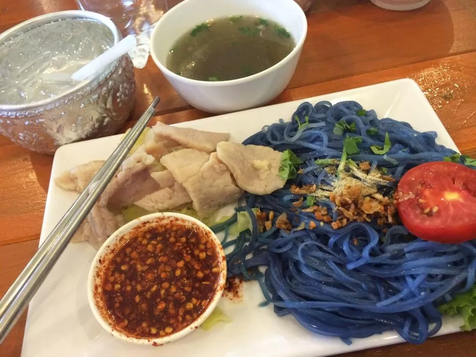 最多人點的便是ก๋วยเตี๋ยวอัญชัน,蝶豆花染成的藍色粿條、配燒(烤)豬肉(雞肉)片和辣沾醬來吃,口感很特別!