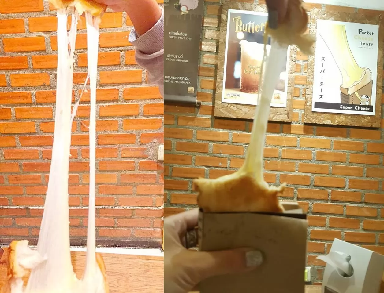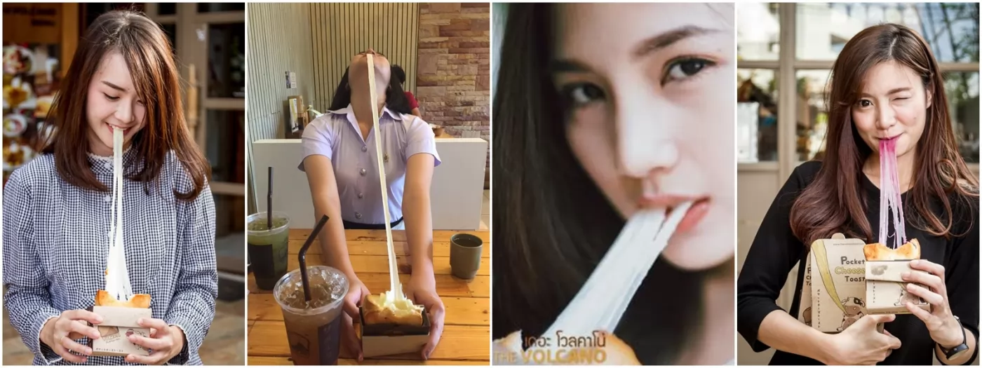 這款吐司變得火紅,主要是清邁學生在社群網站(IG和FB)分享他們各種千奇百怪的「吐絲」照,因為吐司裡夾帶延展性高的起司,可以拉得很長,噱頭十足,在這樣好吃又好玩的帶動下,引發熱潮。