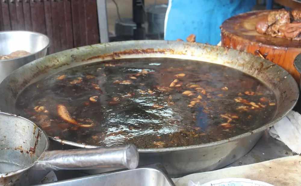 店裡最醒目的就是門口的大鍋,裡有豬腳、蹄膀、滷蛋、豬腸。