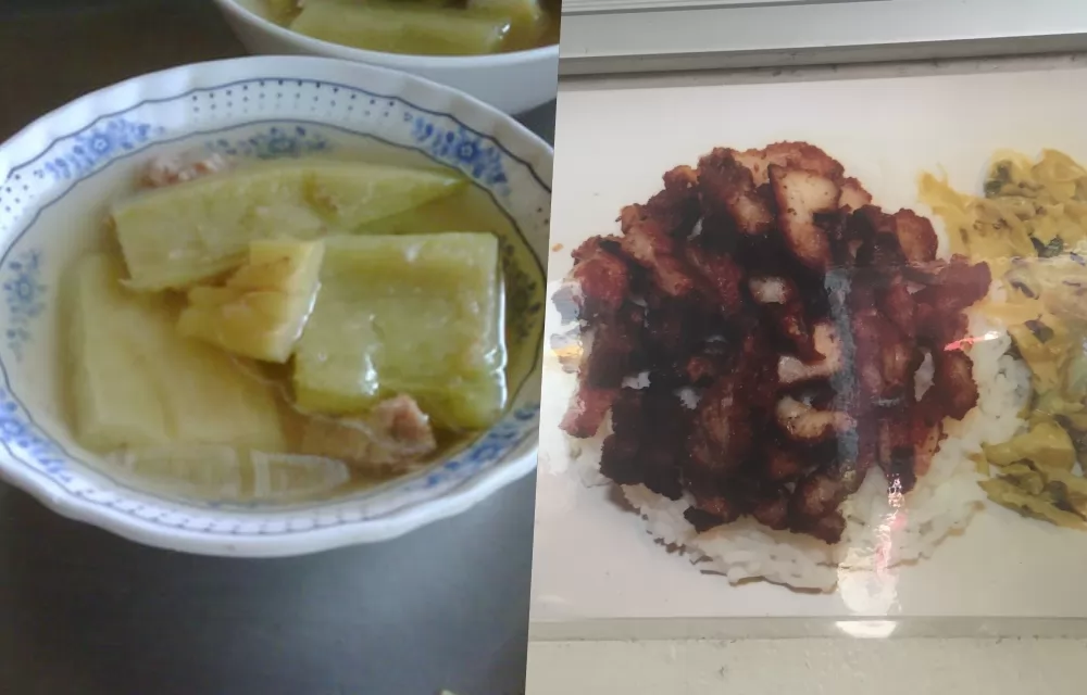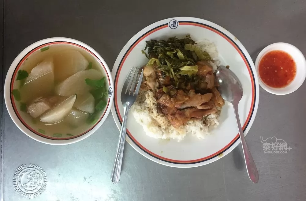 蹄膀飯(ข้าวคากิ)普通1盤60銖、特級70銖,加1碗白蘿蔔湯(แกงจืดไชเท้า),口感更豐富,吃得更過癮了!