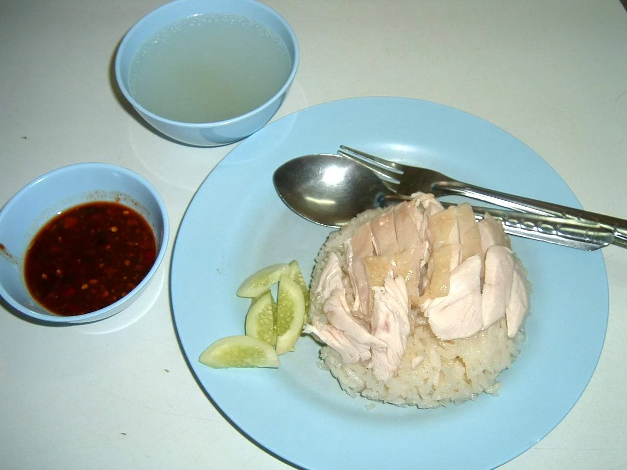 海南雞肉飯(考曼蓋/Kao Mon Guy /ข้าวมันไก่)相傳是海南島的華人移民到泰國而來的,飯是用雞油燜成,香而不膩;雞肉是加料後加以蒸熟,剔骨切片,吃起來清嫩爽口,配上香Q的飯來吃,更是一口接一口,不過,如果不加上各家特有的獨門沾料,那麼雞肉飯就特色全失了,雞肉飯還會配上幾片小黃瓜,綜合一下饕客們的口感,也會附上清湯,讓客人更容易下飯。