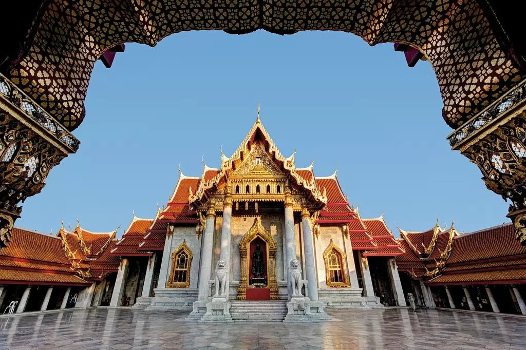 Wat Benchamabophit(วัดเบญจมบพิตรดุสิตวนาราม),寺廟正殿的寺柱、石欄、石獅,石壁及地面等材料都是由義大利進口的大理石,被稱為雲石寺,或大理石寺。