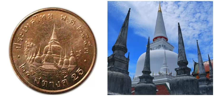 25士丹硬幣背面為洛坤府(จ.นครศรีธรรมราช )瑪哈達寺(วัดมหาธาตุวรมหาวิหาร/Phra Mahathat)的洛•坤佛塔。