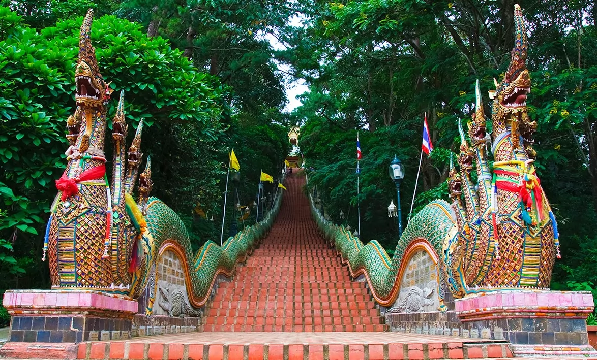 坐落在素貼山上,由於山路兩旁有兩隻氣勢宏偉的彩色多頭神龍守護,所以便叫做「雙龍寺」。泰國皇室建造的充滿傳奇色彩的寺廟,是清邁遊必去景點之一。