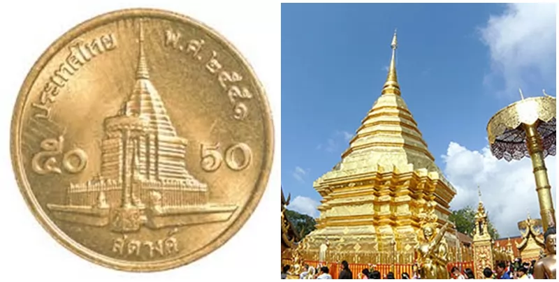 50士丹為古銅色硬幣,背面為清邁著名景點雙龍寺(วัดพระธาตุดอยสุเทพ/Wat Pra that Doi Suthep)。