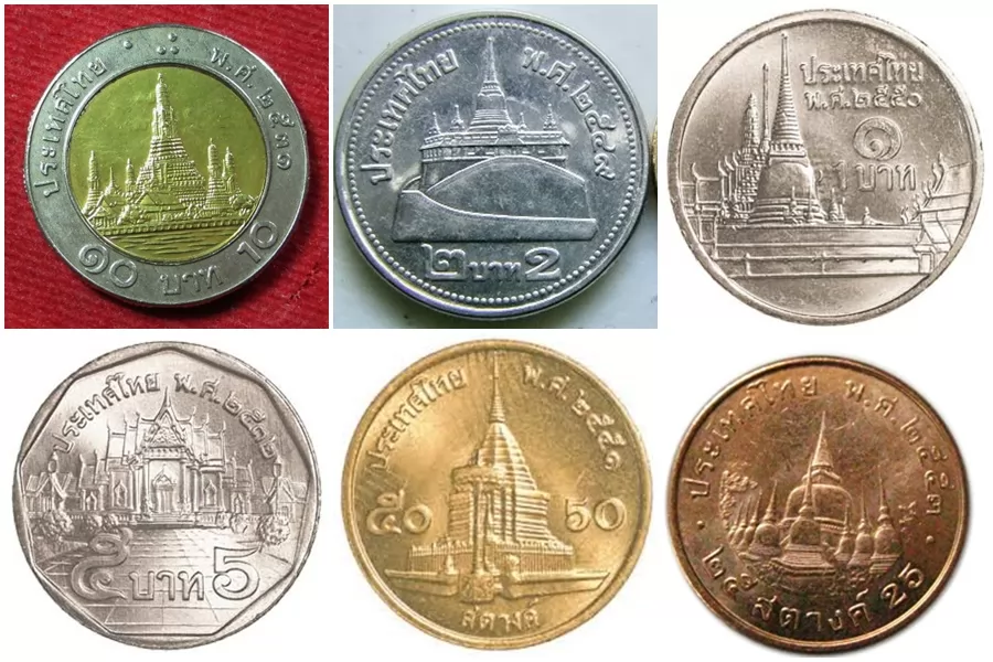 硬幣在泰國廣泛運用,買1瓶水、公車和捷運票、1串烤肉、1份糯米飯...,都需要硬幣,目前主要流通的硬幣有10銖、5銖、2銖、1銖、50士丹和25士丹。