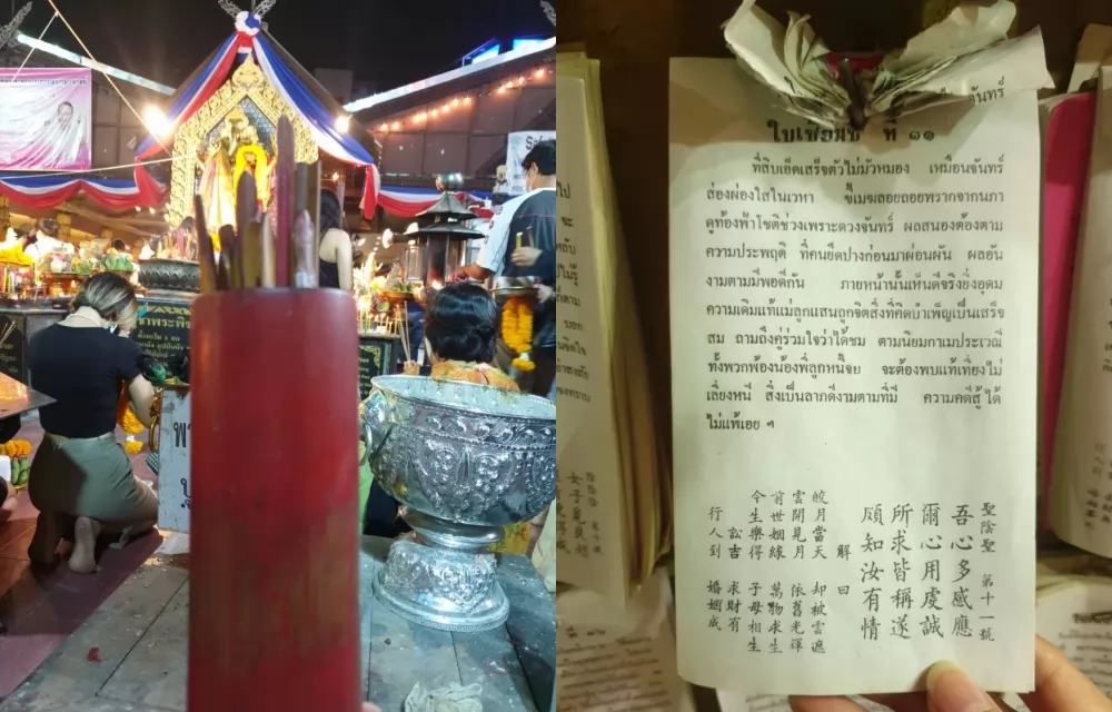有的信眾在參拜時也會用求取籤詩方式,不同於台灣用抽籤的方式,這裡的信徒跪在地上搖籤筒,第一枝被搖出來的就是被選中的籤詩。然後到旁邊的找尋解籤紙條,有趣的是象神的籤詩是中文和泰文並陳,有些籤詩解文與台灣廟宇相近。