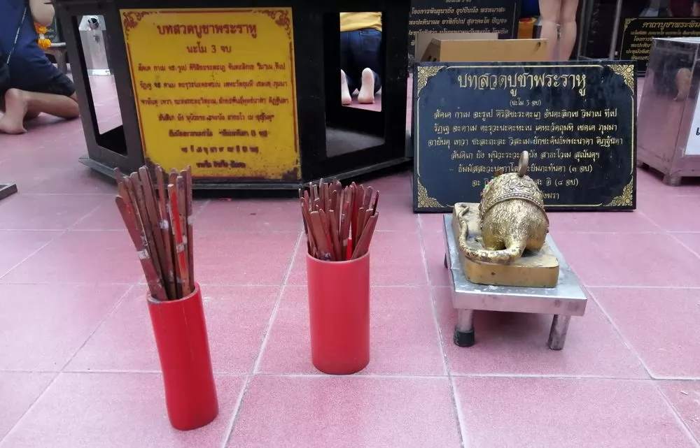 有特別祈求的方式,需要擲筊,這是來自中國道教,原本彎月形的筊杯在這裡變成梯形,擲出的筊不是要一正一反,而是同一面才行,然後還要有小姆指勾起厚重的金老鼠磚,才能獲得象神的認可,願望才有機會實現。