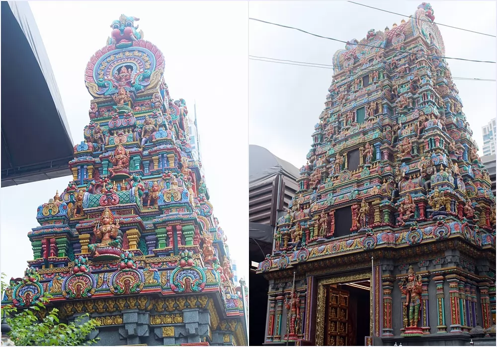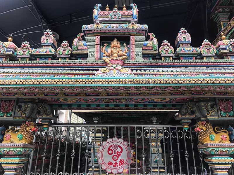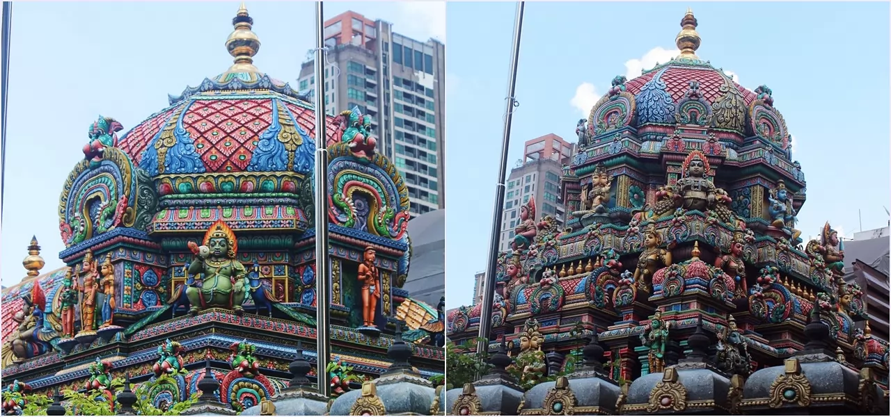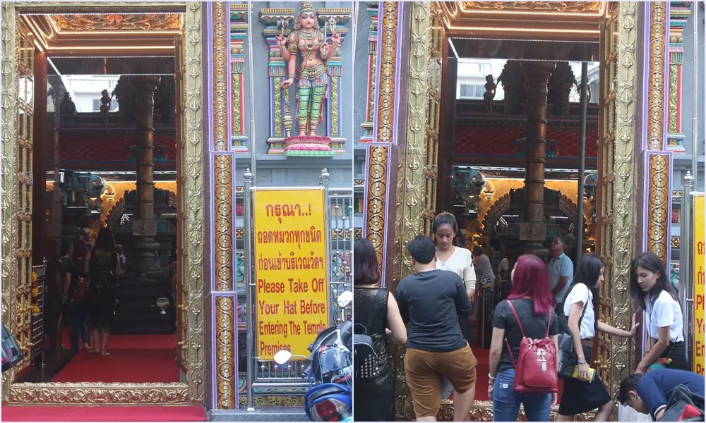 寺廟入口是華麗裝飾的門塔(Gopuram),進入参觀,需要脫帽子,有的當地人跟進泰國佛寺一樣的脫鞋,把鞋子留在外面,廟裡也不許拍照,沒有門票,可以免費進入,看到的是風格華麗、各種色彩輪換、各種神像緊湊排列,讓人眼花繚亂,但體驗不同的宗教文化。