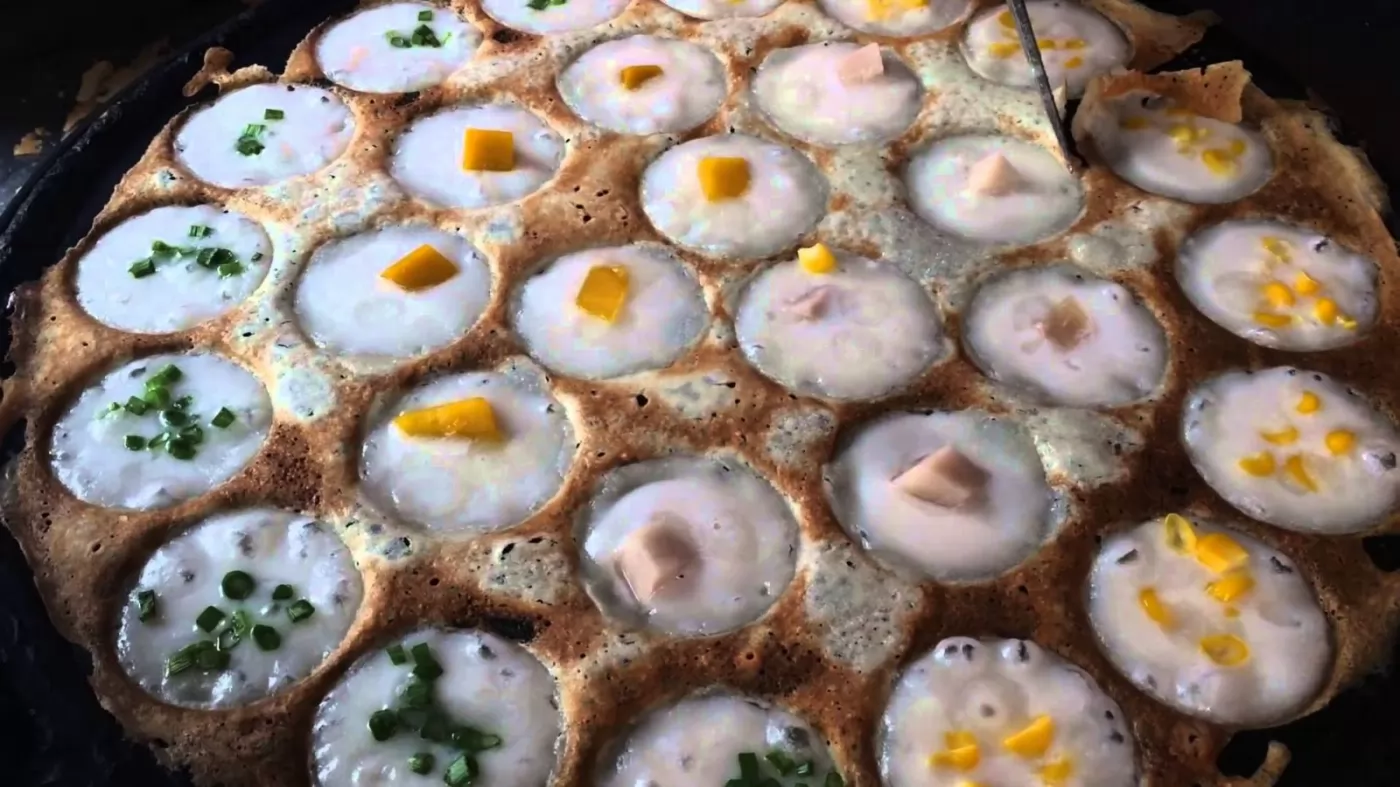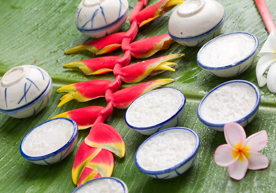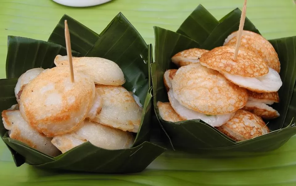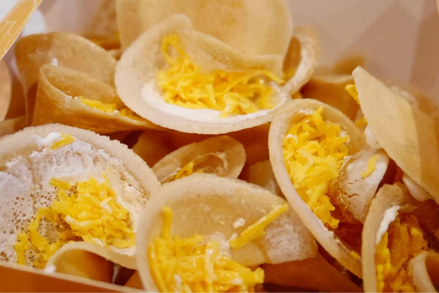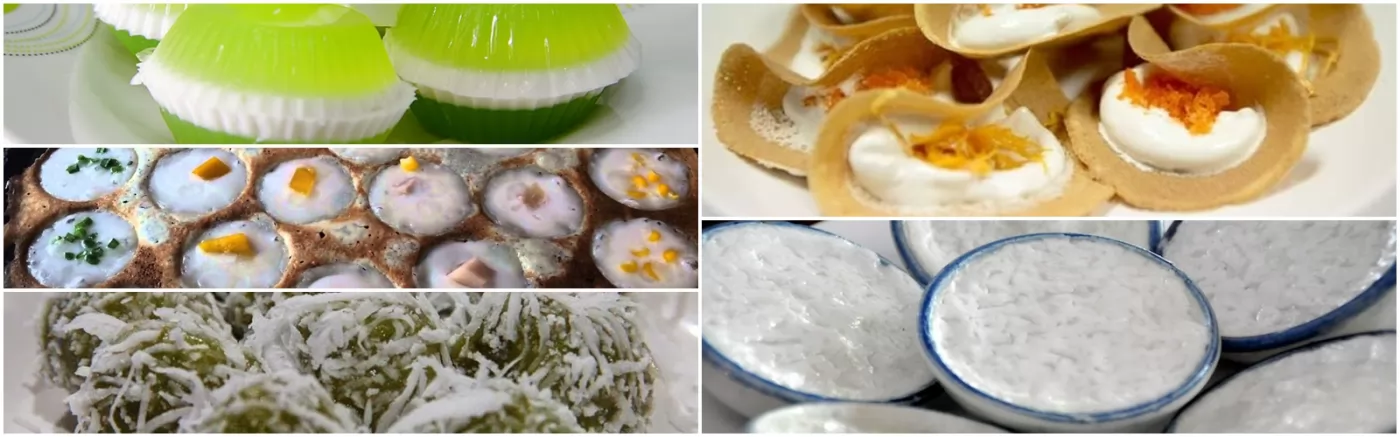 椰奶小脆餅(Kha nom Buang):米粉、玉米粉、蛋黃、棕櫚糖和少許的鹽用水調和成麵糊,在燒熱的鐵板上塗上一層薄薄的麵糊,中間加入厚椰奶霜,然後鋪上切成細絲的蛋絲或椰絲,最後用特製的煎餅刀從烤熟的面皮一邊翻往另一邊壓住定型,看上去像個小元寶就完成了!
