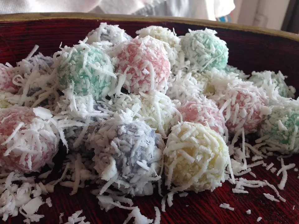 椰絲甜點是以椰漿和椰絲加上糯米及糖,也是經過連串繁複手續製作而成,用各種天然色素製成的糯米球、片,加上椰絲,一口咬下滿滿的椰香衝向腦門,彈牙的糯米和椰絲口感,讓人一口接一口,1盒6顆約20-25銖。