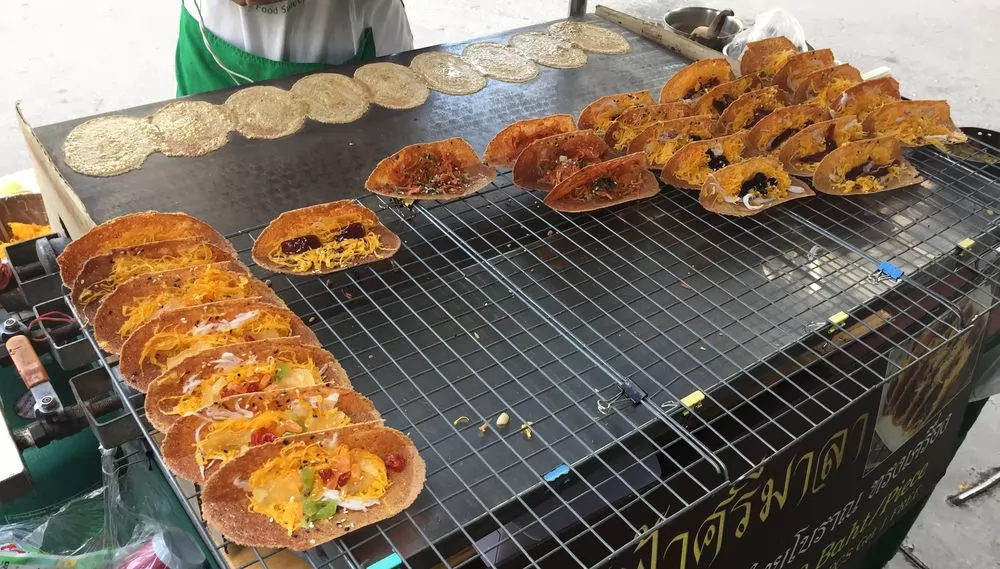 椰奶小脆餅通常有鹹、甜兩種口味,黃色的是甜味,紅色的是鹹味,烤的酥脆的餅皮與香甜滑口的椰奶霜形成絕配。1個大約10銖。