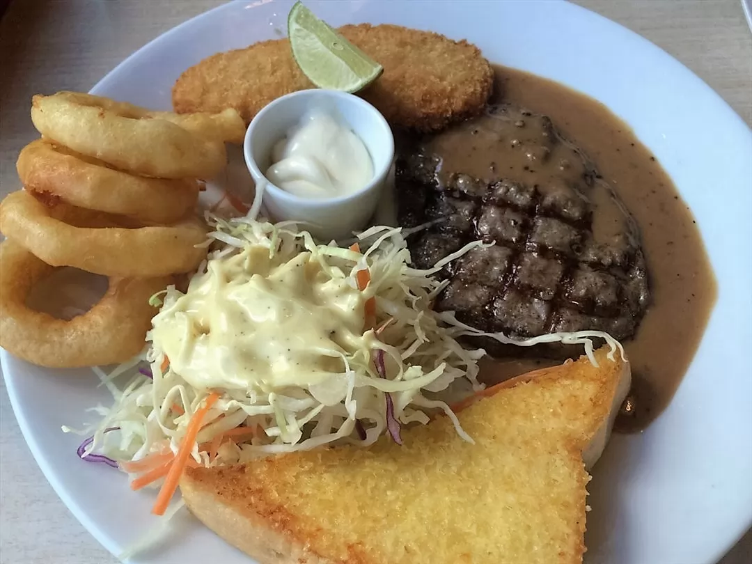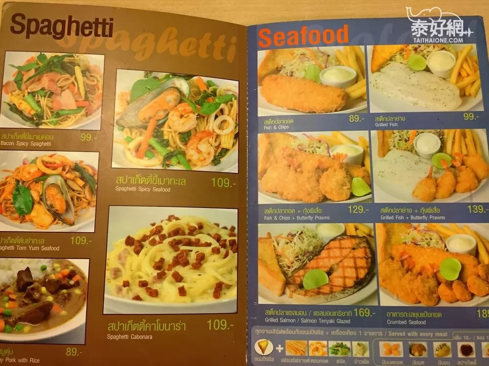 雙主菜組合只要129銖、139銖,可自由配,肉質最高級的牛排也才350銖。