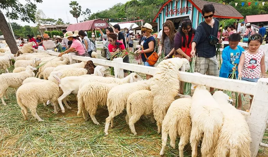 這是一個充滿夢幻風格的綿羊牧場,適合一家大小和情侶遊玩,門票大人50銖,兒童120cm以上30銖,80cm以下免費,遊客入場可憑票得到一束大草拿來餵羊,看著草地上的綿羊群、水裡的天鵝、呆萌的羊駝,牧場內有懷舊車擺設和一些小朋友的遊戲,每一處都適合打卡拍照。