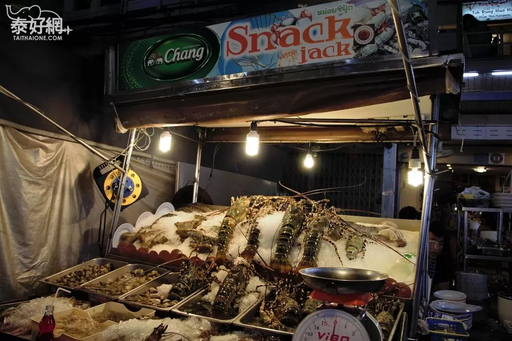 在後段夜市有幾家平價炭燒海鮮檔,鮮魚、大蝦、肉蟹、龍蝦、魷魚……這裡的餐廳都會把自家海鮮擺在門口的冰塊上,海鮮邊上會有中文標示,遊客從門口經過,八成就會被個頭誇張的大頭蝦、螃蟹和龍蝦吸引,店鋪前招徠顧客的夥計都會一兩句中文,走不出多遠便被俘虜了。