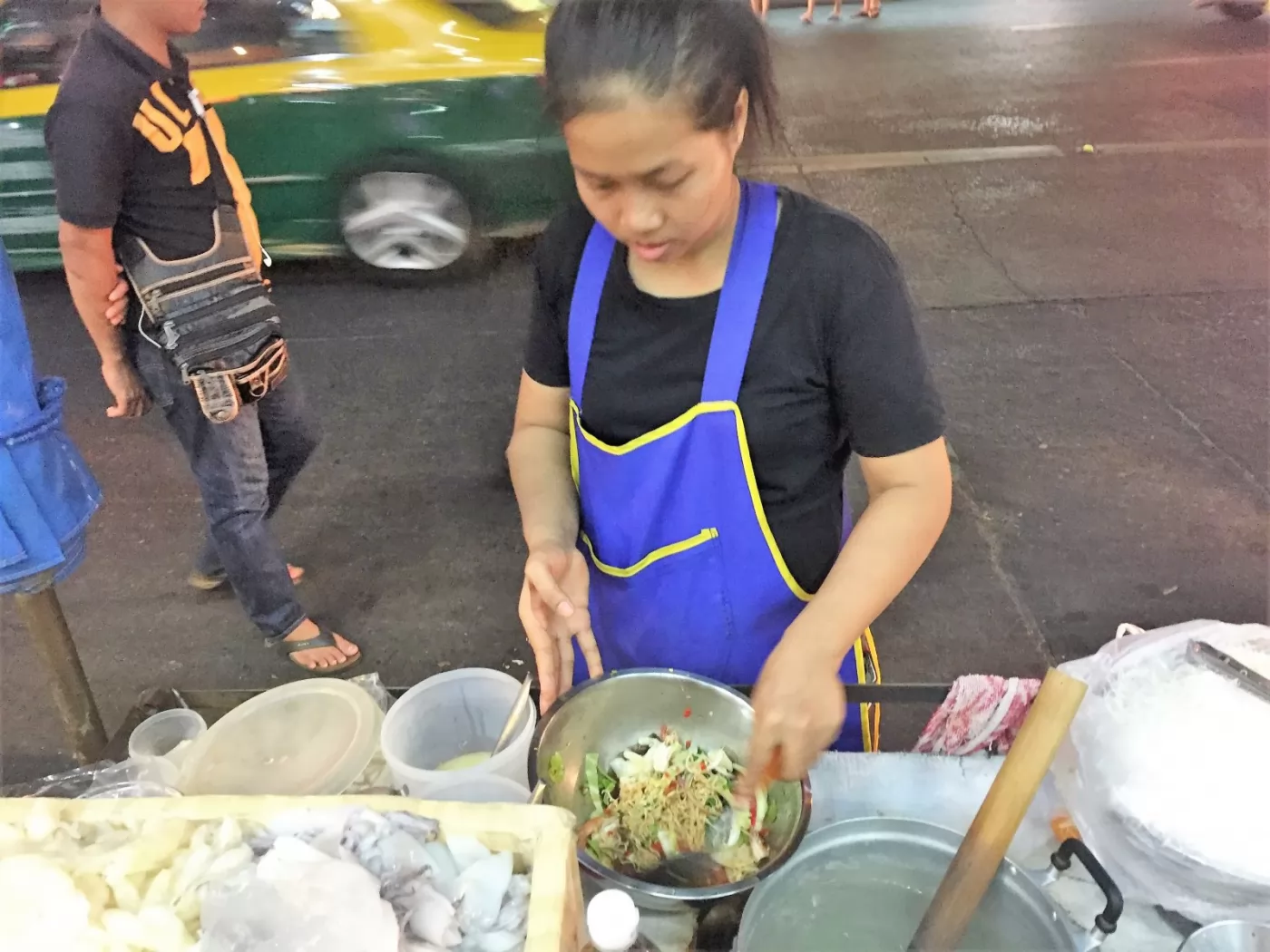 1盤或是1碗涼拌酸辣MaMa泡麵,路邊小攤位價格一般是40-50銖,要是在景區或者是在別的餐館價格會漲到60-100銖不等。