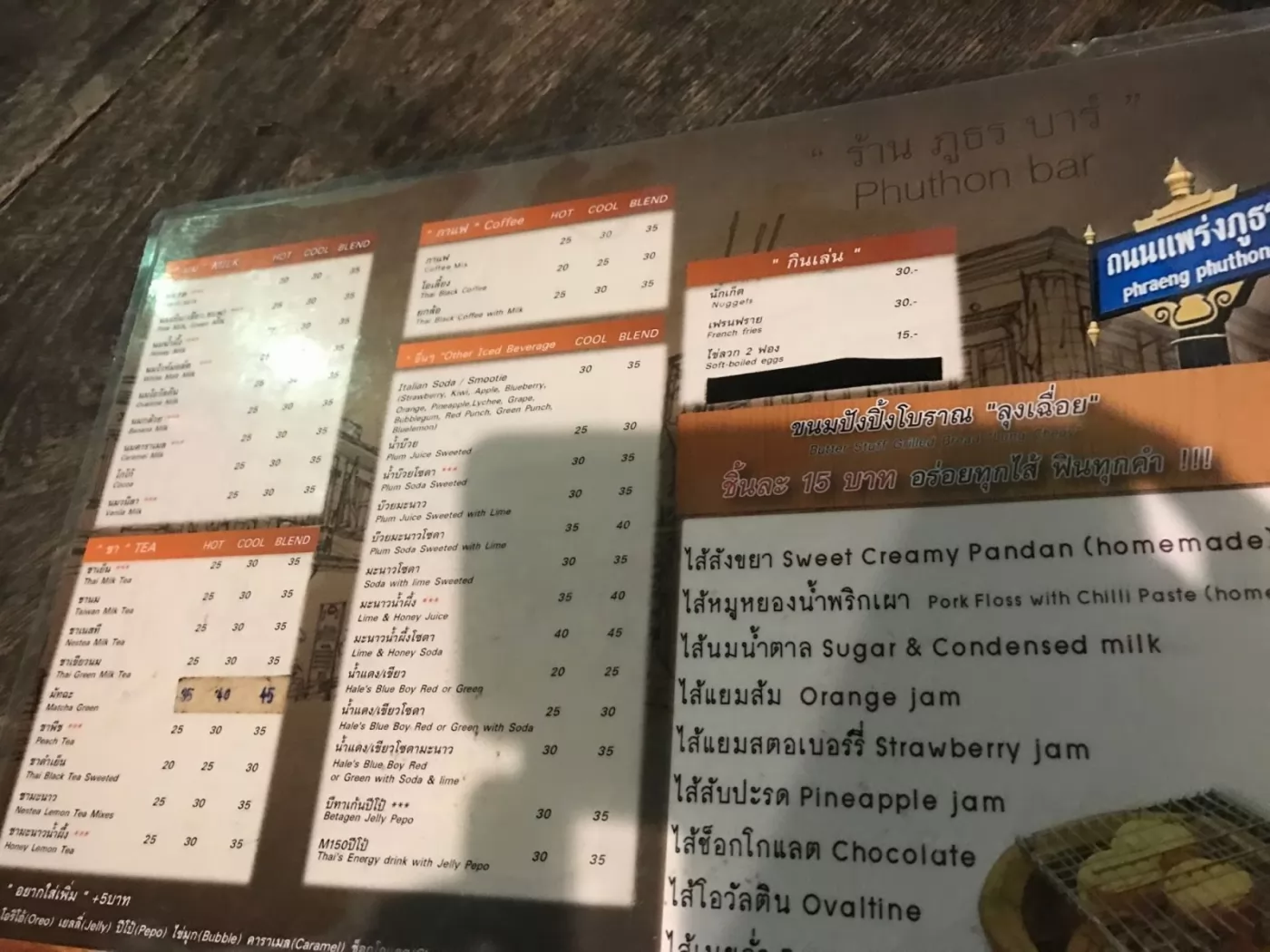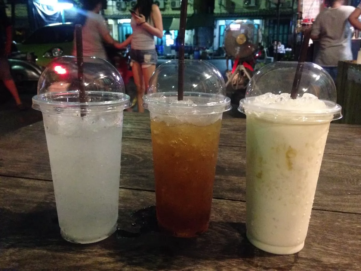 麵包有些乾,這裡也提供各式冷飲(咖啡、水果汁、汽水、奶茶等),價格也不貴(最高45銖),兩者搭配,吃起來實在是愜意!