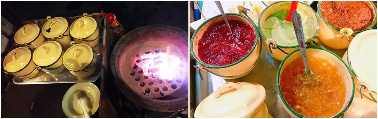 厚實的麵包從中割開,然後再塗上醬料,再用鐵夾放在炭火中燒烤,如此簡單,但是當烤麵包用鐵碗送上來(感覺很奇特,爺爺時代的用品啊),吃下去,真的是美味,在麵包特有味道中帶有醬料的香甜,象哥點的3種甜醬口味都好吃,難怪那麼多當地人會來光顧。