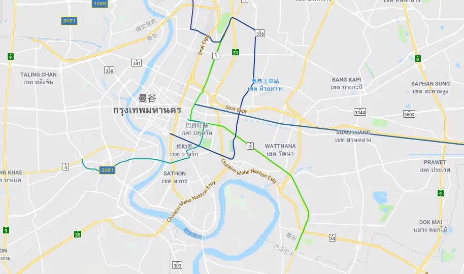 目前湄南河大曼谷市區段,以中心碼頭(entral Pier)為起點,往北的碼頭以N編號(1-N33),往南的碼頭以S編號(S1-S4),有5條路線,分別以船頭船尾掛綠旗、黃旗、橙旗、藍旗和不掛旗相區別,不掛旗為慢船,每站都停;藍旗船為旅遊觀光專線,覆蓋10個主要景點碼頭;其他綠旗、黃旗、橙旗為正常的交通快船,有選擇性地停靠部分碼頭;每10-20分鐘一班,營業時間在 6:00-19:00,值得一提的是,週末假日交通快船只有橙線船運行