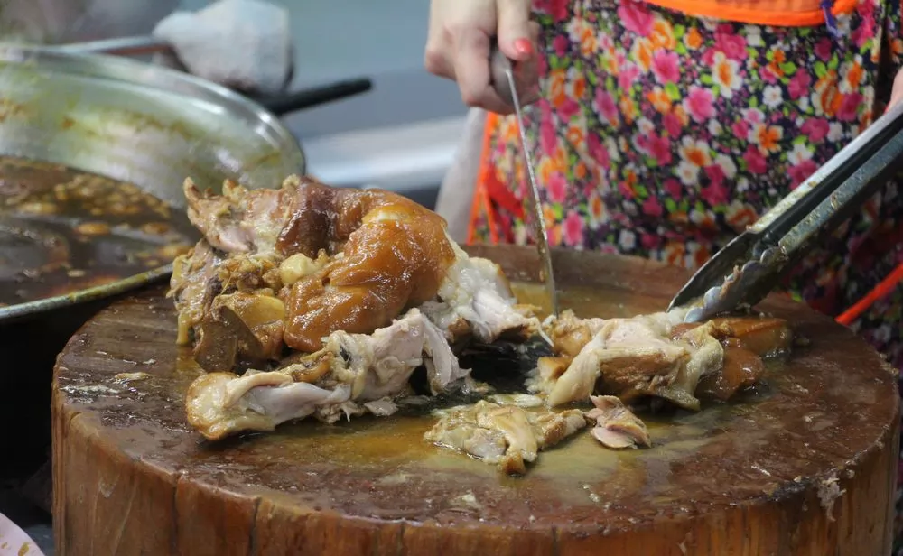 店家撈起豬腳,放到一塊大木板切割,然後裝到盛好飯的盤子,添上些花生和酸菜,一盤好吃的豬腳飯就送上桌。