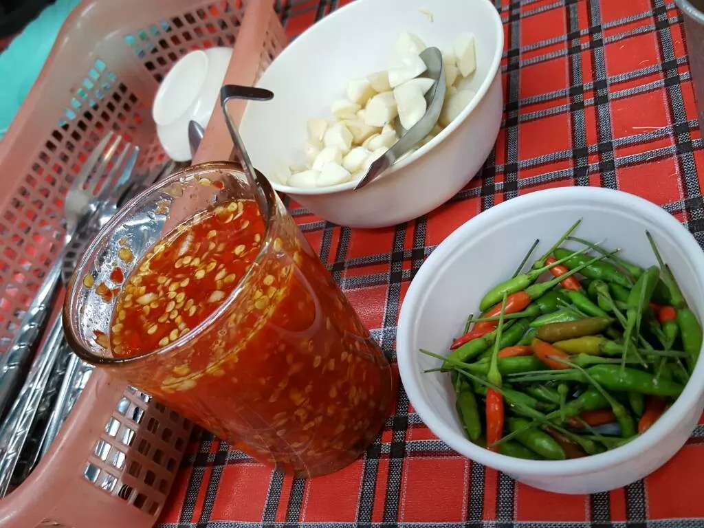 加上辣的沾醬,以及生蒜和辣椒,象哥在大熱天下吃得過癮!普通一盤45銖+2銖的冰茶,如果帶走則是50銖。