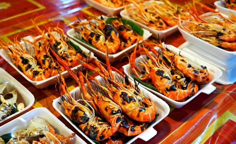 烤大頭蝦(Goong Yang),蝦膏經炭火燒烤後,入口甘香松化,為下酒精品。