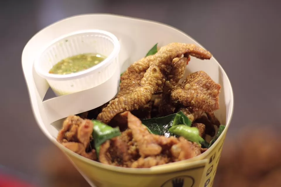 各種口味的脆皮雞肉會裝進倒三角形的紙盒,還有放沾料的小碟子,1份69銖。