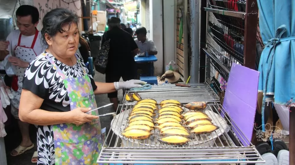 與一般的(割皮)烤芭蕉不一樣,這是只劃開一道皮,然後帶皮燒烤,芭蕉色由白變金黃,吃起來軟嫩,甜味也增加。