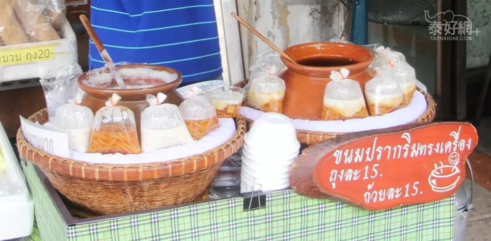 這是泰國傳統的小吃,類似湯圓(球形和長條形)的食物(鹹味),加上甜椰奶,不錯吃,1袋或1碗15銖。