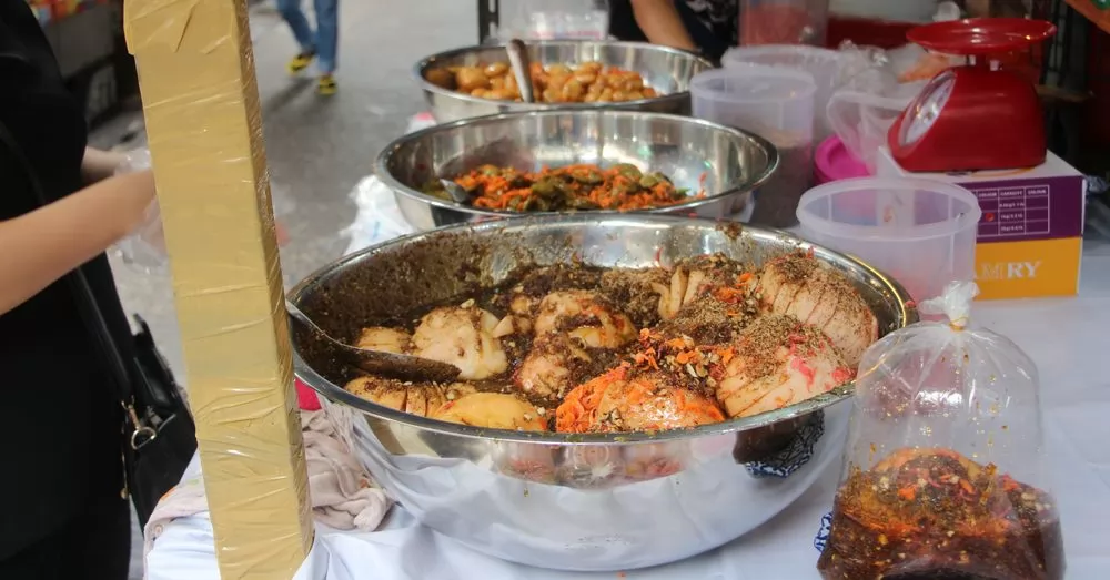 มะกอก和สละ都是種果子,用來醃製,加上糖和辣辣,酸甜辣在嘴裡碰撞。以重量計價。