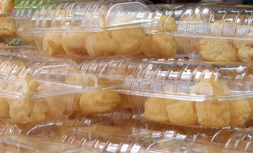 這是小泡芙蛋糕,裡面有餡料:牛奶、巧克力、香蘭葉汁,小心會爆漿。1盒以大小分為20、30、50銖。