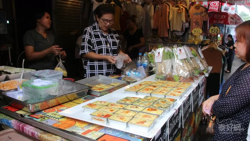 泰國的傳統小吃韭菜粿,原本是道地的潮州出名小吃!還有其他口味,像是豬肉、蝦仁粿等,小盒和大盒從35到60銖不等。