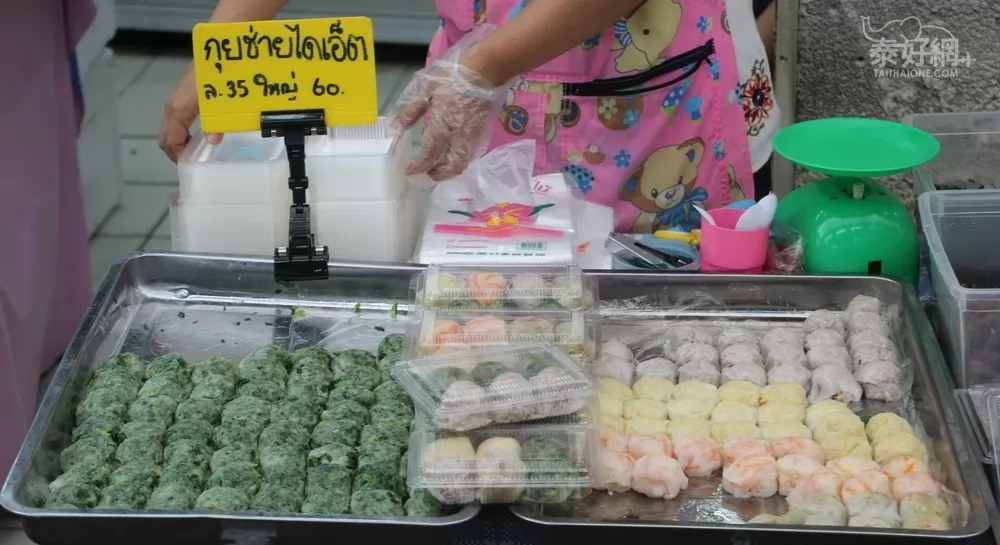 用各種天然色素製成的甜糯米片,裹上豆米,1盒6個約30-60銖。