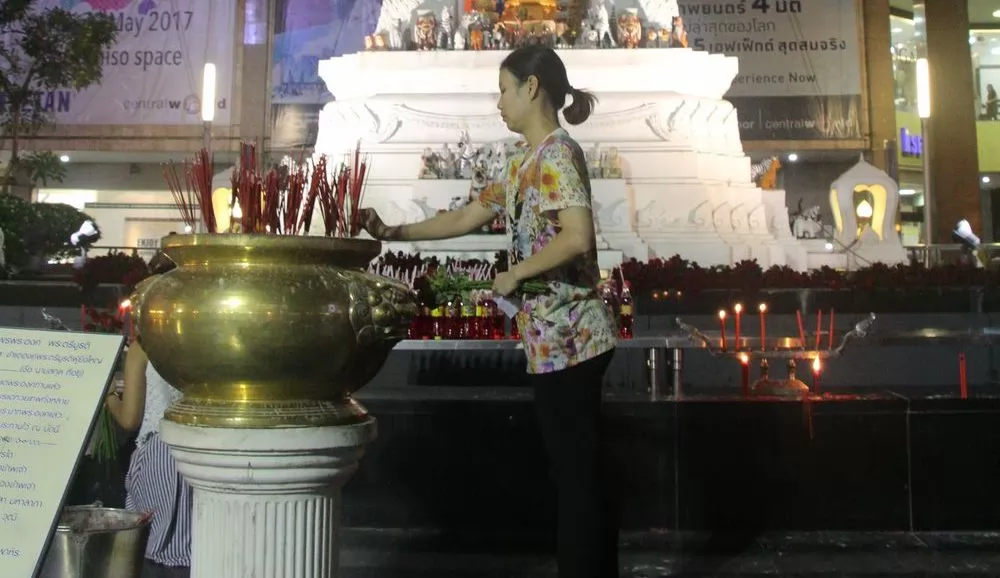 數米之外便是曼谷繁忙的道路,此處卻很靜謐,信徒誠心祭拜。