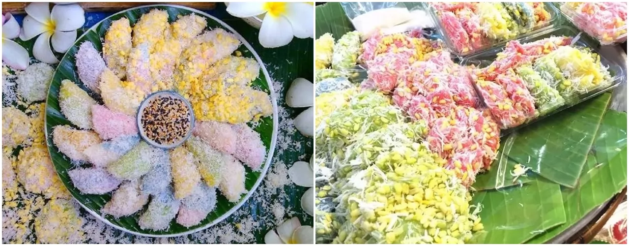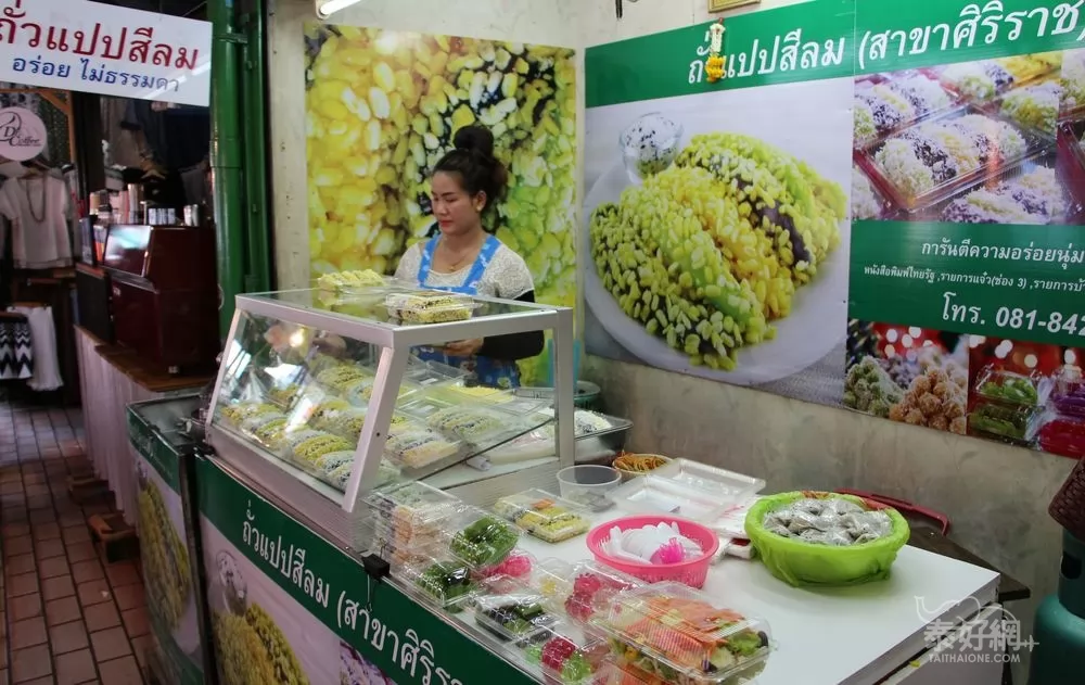 椰絲豆仁軟糕(ถั่วแปปสีลม),製作這款甜點可是需要俐落的身手。首先,用黃豆、椰子絲和白糖做餡,再裹上糯米漿,下鍋煮後,外層鋪上椰絲再撒一層白糖。再講究些的會用香蘭葉把面皮染成綠色,吃起來就會有淡淡的香蘭葉香味,或是用紫糯米染成紫色,這樣就能呈現出不同的色彩。