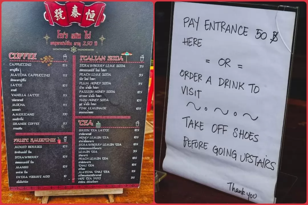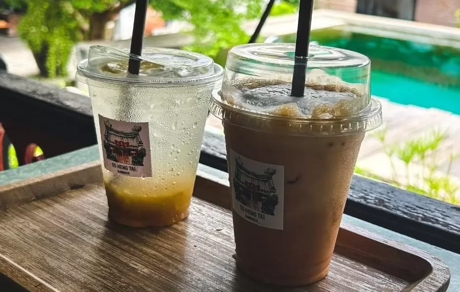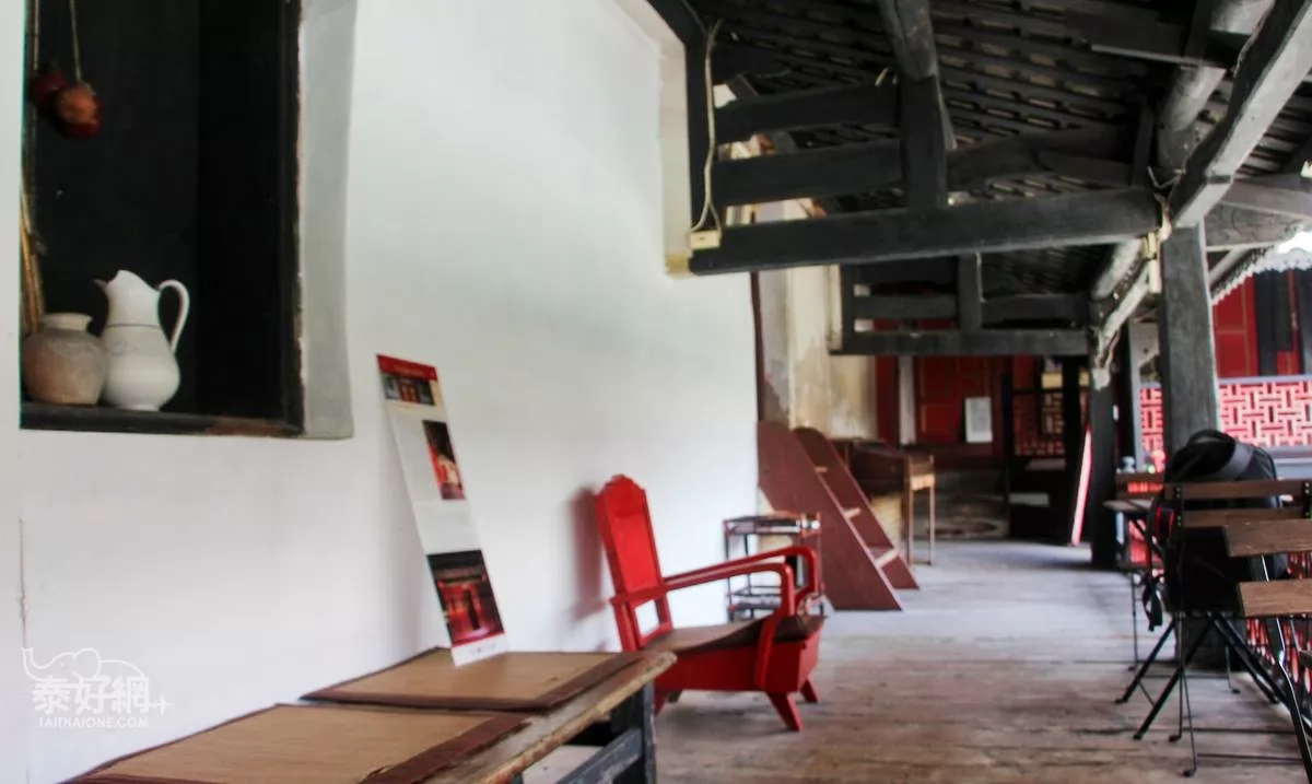 廂房外擺著幾張桌椅讓訪客休憩,泰客點1杯冰拿鐵(2024年調漲到105銖),吹著大電風扇(沒有冷氣),慢慢喝著,難得在200年前的豪宅,想像如當時的主人般(喝的應該是茶或酒),享受悠閒時光的場景。