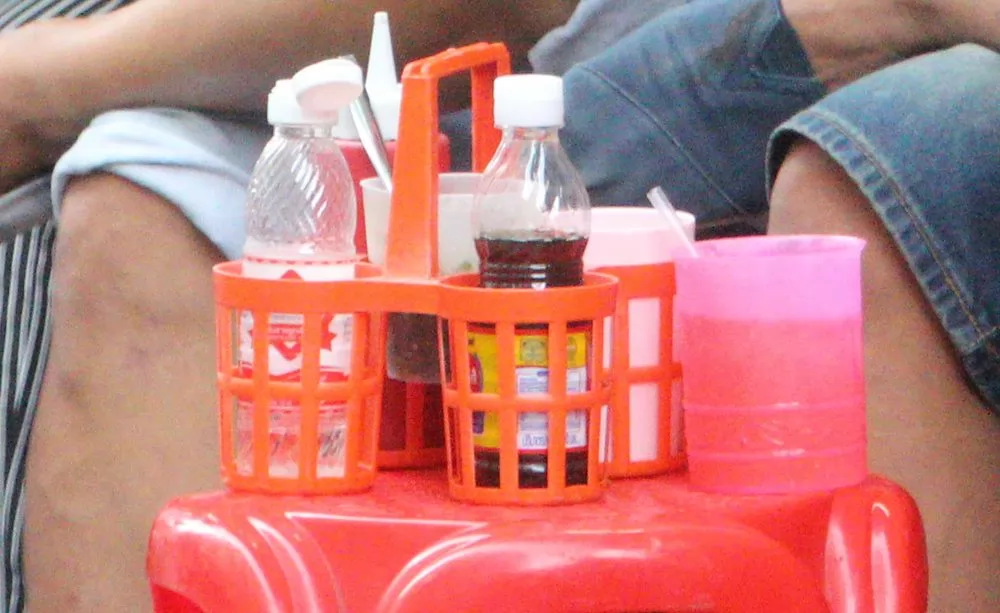 攤車旁有辣椒、魚露等佐料自取,也有漱口盅裝著的冰茶自取。