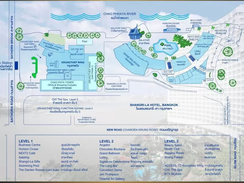 [交通]:搭BTS捷運到Saphan Taksin站下;搭交通船到Si Phraya / Wat Muang Kae/ Oriental碼頭下;從機場到飯店最好是坐計程車。