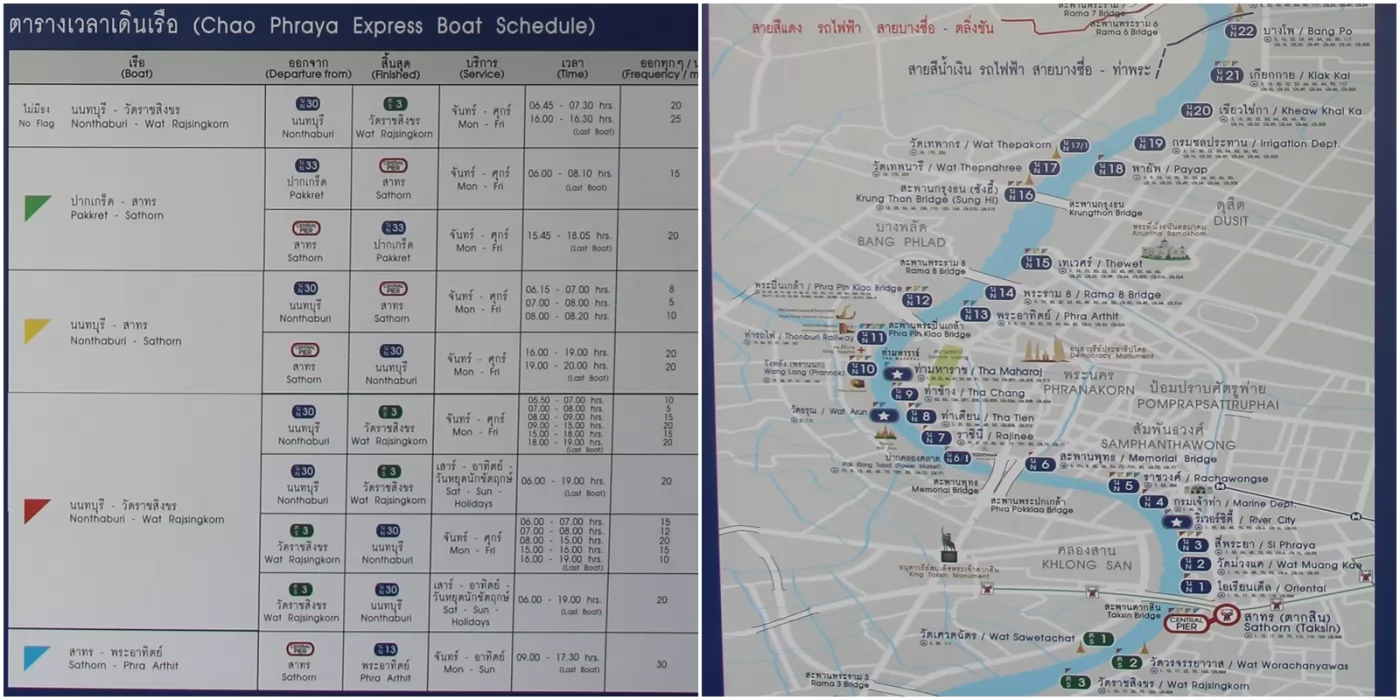 交通船有5條線,分別以船頭船尾掛綠旗、黃旗、橙旗、藍旗和不掛旗相區別,不掛旗為慢船,每站都停;藍線船為旅遊觀光專線,覆蓋10個主要景點碼頭;其他顏色為正常的公交快船,有選擇性地停靠部分碼頭;公交船一般每10-20分鐘一班,執行時間一般在 6:00-19:00,週末只有橙線船運行。[相關資訊請看湄南河搭交通船10大攻略]