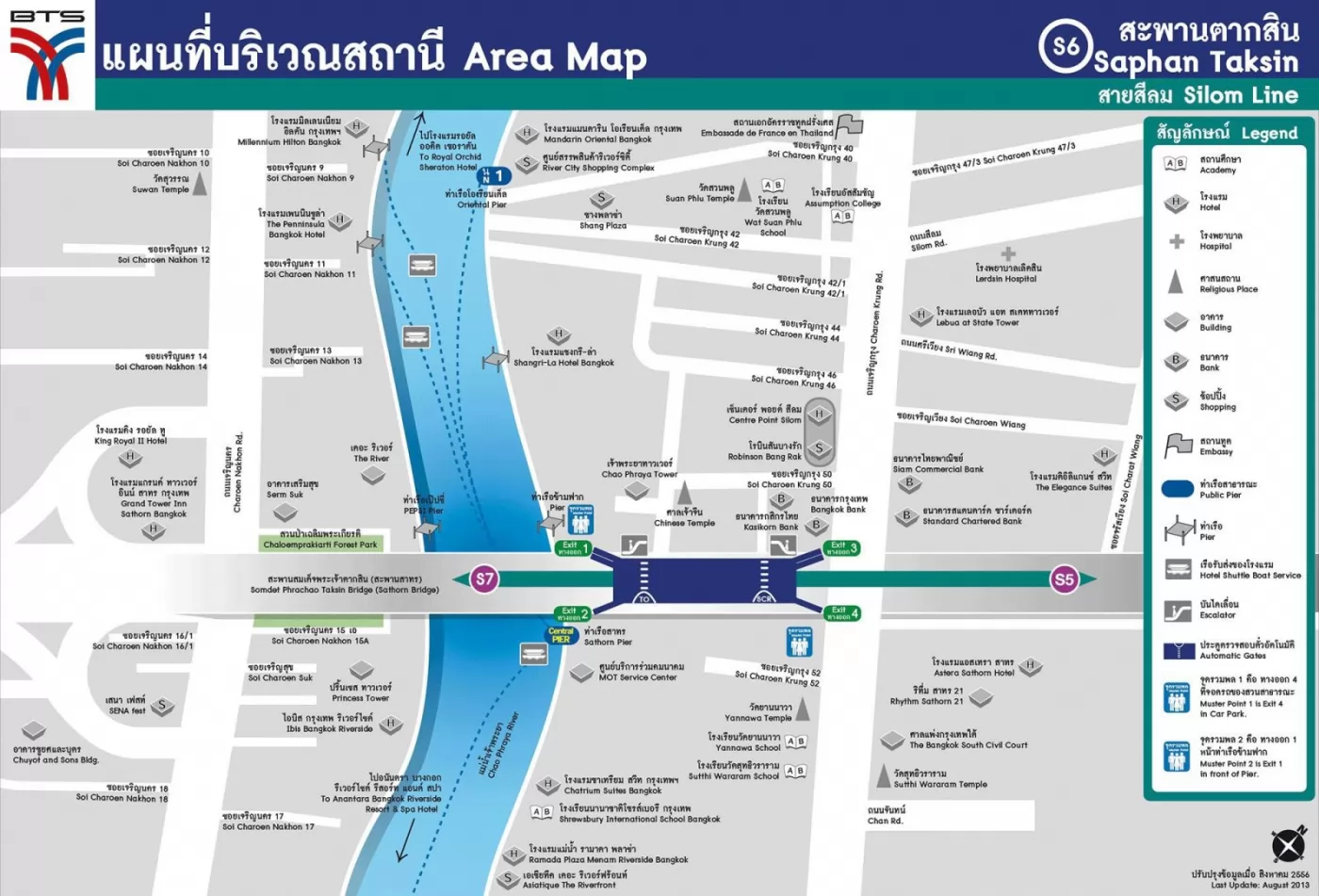 Saphan Taksin捷運站旁,就是湄南河交通船的中心碼頭(Central Pier)—Sathorn Pier,往北的碼頭以N編號(N1-N33),往南的碼頭以S編號(S1-S4),目前交通船沿途共有30多個停靠碼頭。