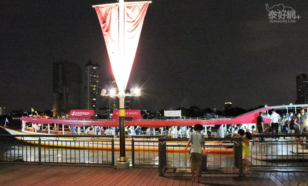 想搭船去Asiatique碼頭夜市,一是在中央碼頭Sathorn買票(1人約20銖)搭船前往;二是搭乘免費接駁船(時間17:45-23:00)。