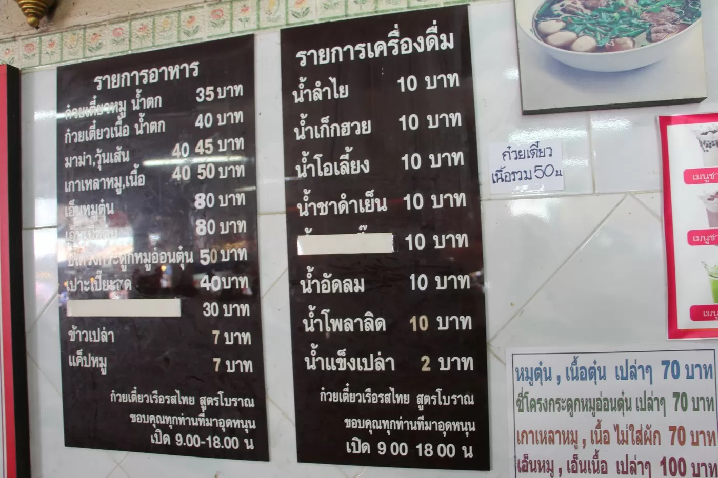 泰客與人拼桌,牆上有菜單,粿條有豬肉和牛肉兩種,點了碗牛肉粿條(40銖)、1杯冰泰式黑咖啡O涼(10銖)。豬肉粿條(35銖)。