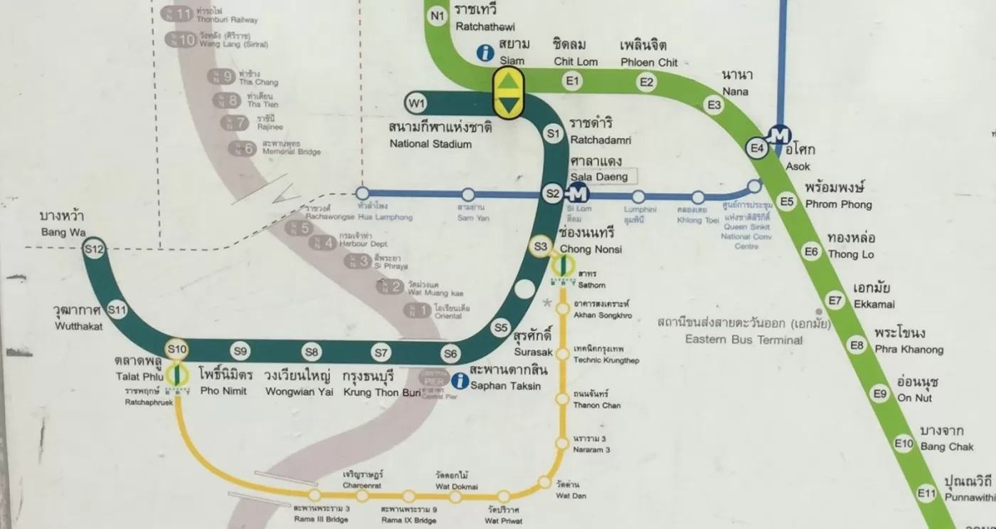 車站就在拉瑪一路(Rama I Road)與披耶泰路(Phaya Thai)的交叉口上,有天橋連結MBK Center、Siam Discovery Center、Bangkok Art and Culture Centre and Siam Square,人潮不斷穿流,走向各自的目的地。