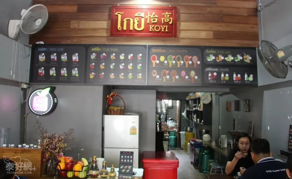 牆上貼著古舊的海報和照片,還有紅底黃字的牌匾懸掛在正中,用中泰英寫著「高怡」店名。下面是新賣的冰品種類和價目表。