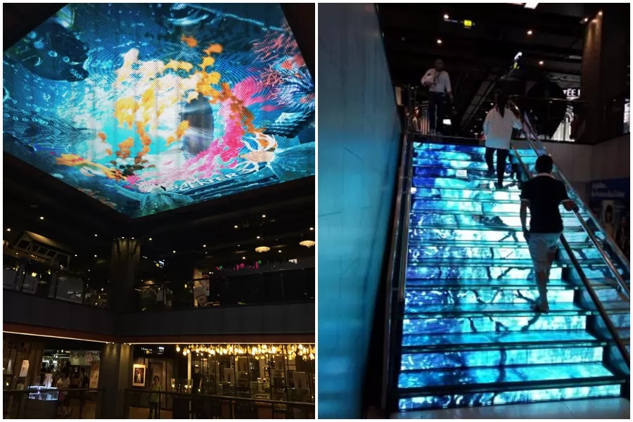 無論走到哪裡都有視覺享受,天花板、樓梯的立體LED投射營造出豪華感。